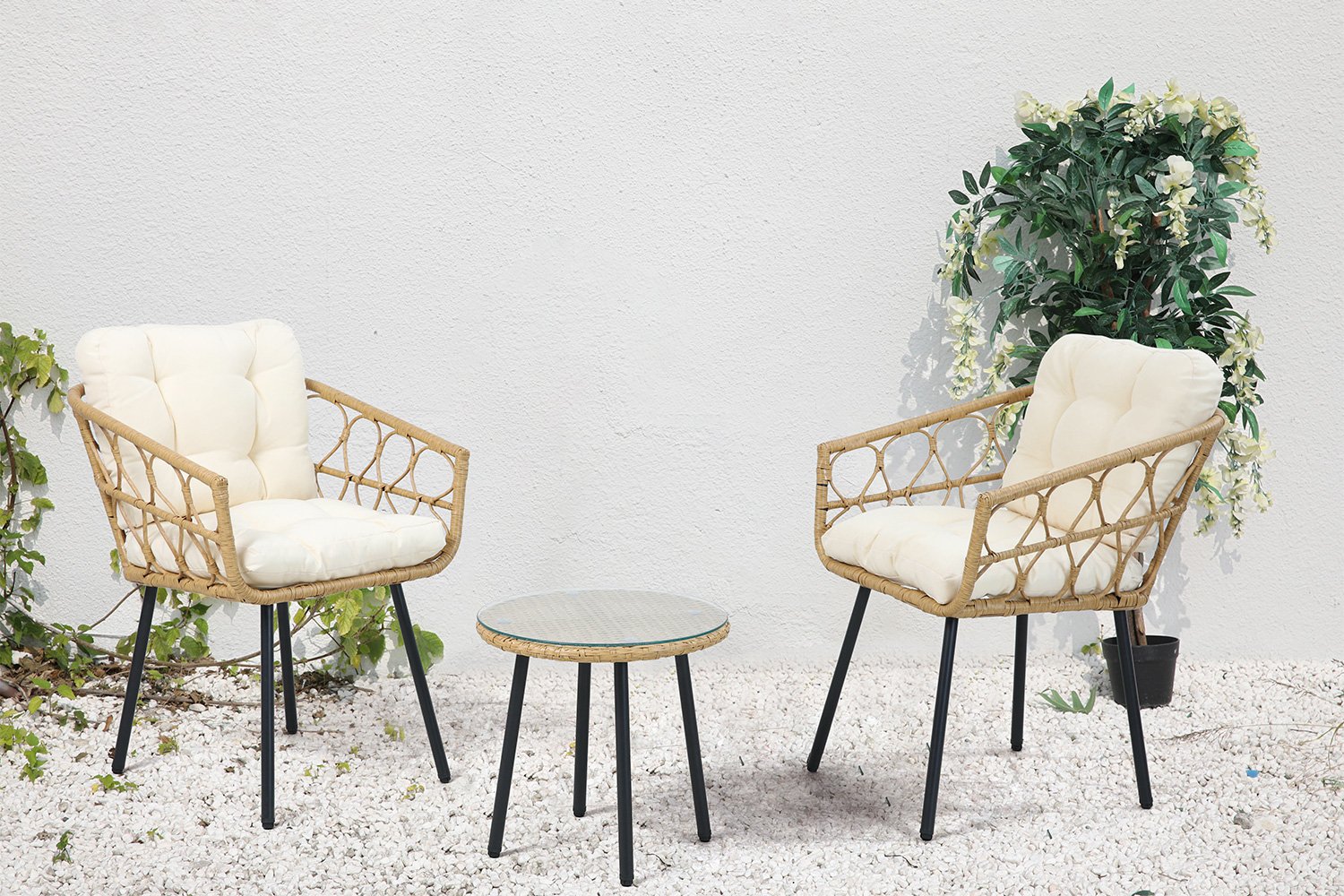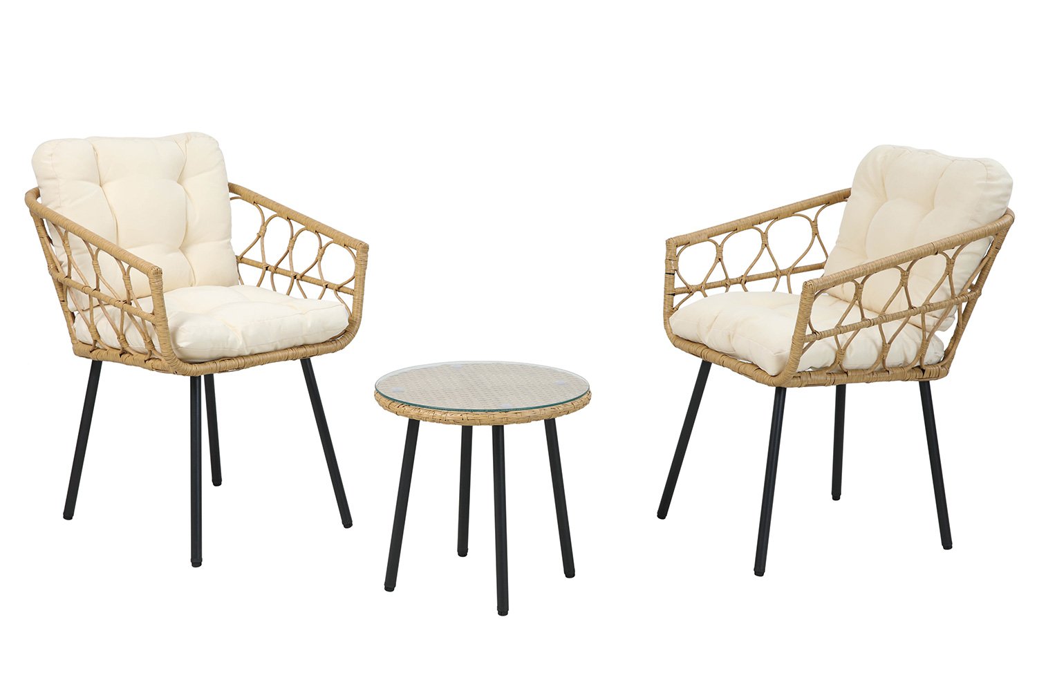 Внешний вид мебели: подлокотники с широким переплетением искусственного ротанга бежевого цвета у кресел предают им нежный вид. Такое же, но плотное переплетение образует столешницу столика, сверху него лежит закаленное стекло, которое обеспечивает дополнительную прочность. Ножки и столика, и стульев – черные, материал – сталь.