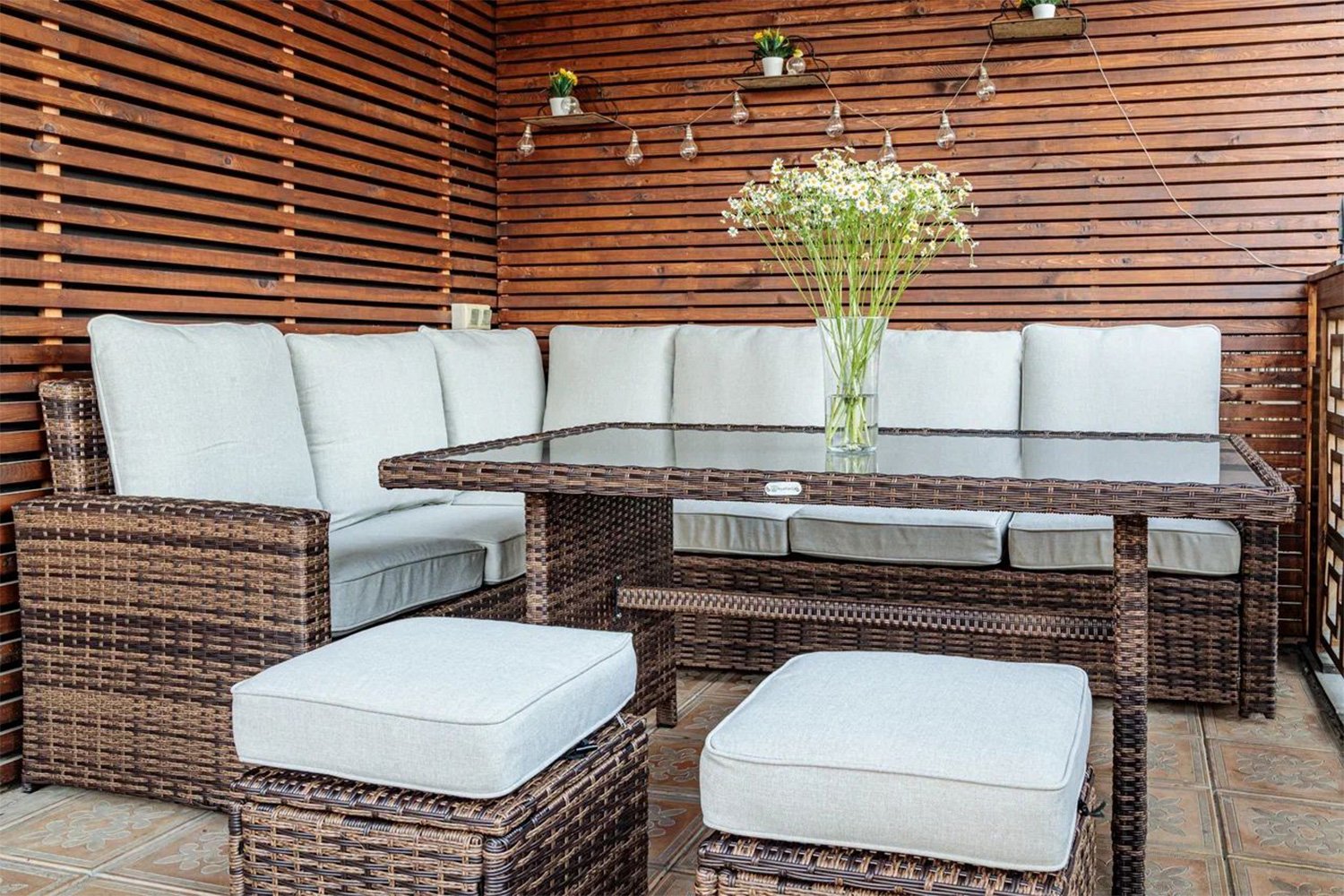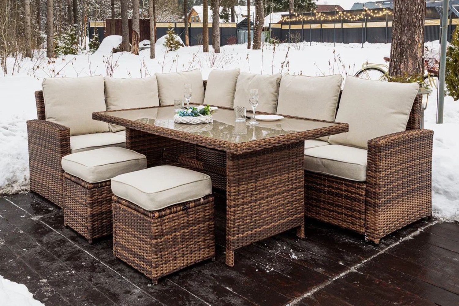 В комплект Zorro входит 4 элемента мебели: угловой диван 242х81х183 см, обеденный прямоугольный стол 150х70х90 см, два пуфа 40х33х40 см. все элементы мебели состоят из стального каркаса, полностью скрытого оплеткой из искусственного ротанга коричневого цвета. Дизайн мебели не вызывающий и приятный для глаз, при этом размеры мебели позволяют вместить около 8 взрослых людей для проведения трапезы или мероприятия за просторным высоким столом.