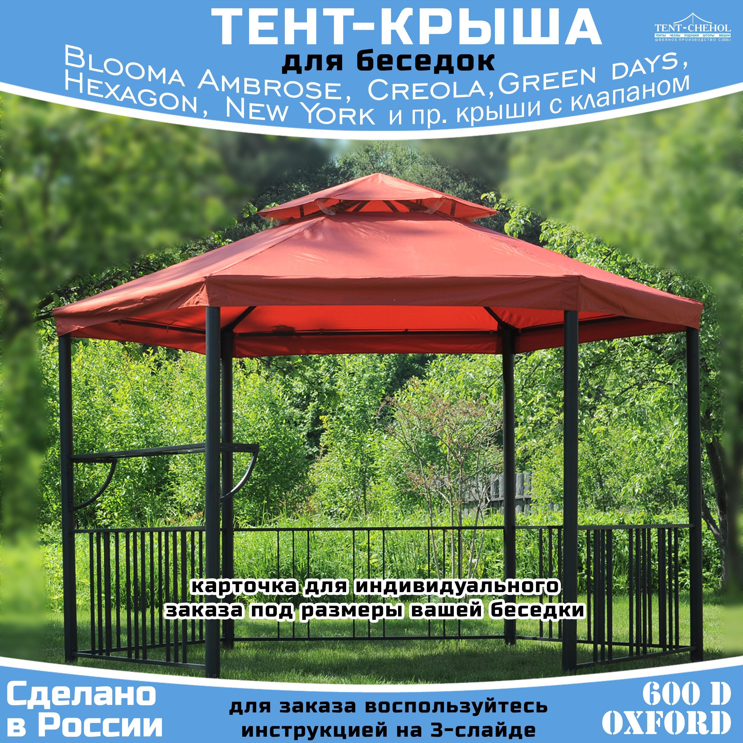 Запасной тент предназначен для замены покрытия крыши у шестиугольного павильона (беседки, шатра) Blooma Creola, Ambrose, New York1, Hexagon, Castorama Hexagon Gazebo, Green days и других шестигранных беседок с клапаном на крыше.Тент изготовлен из прочной ткани Оксфорд 300D c водоотталкивающей пропиткой PU1000.